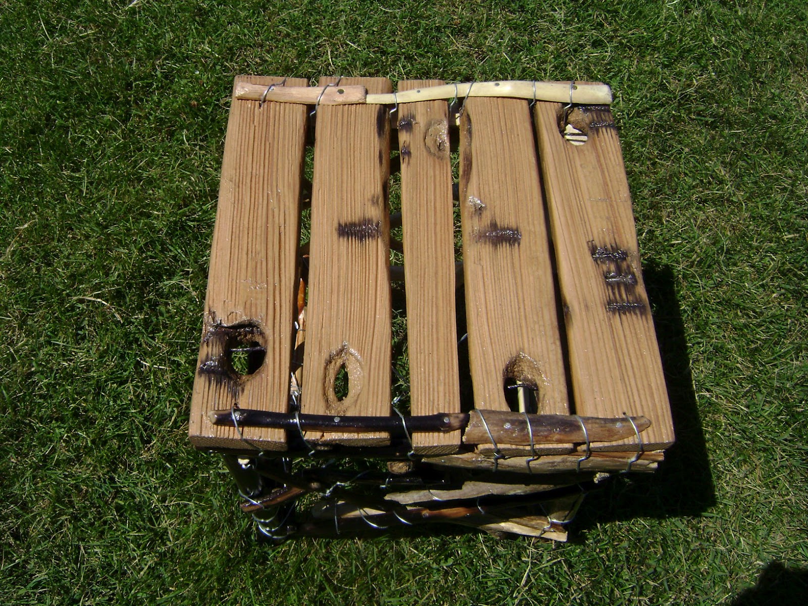 This stool, its seat made of part of an ancient ladder, is also a good illustration of another old saying, "What goes up, must come down." I was thinking I could name this the "Karma stool".